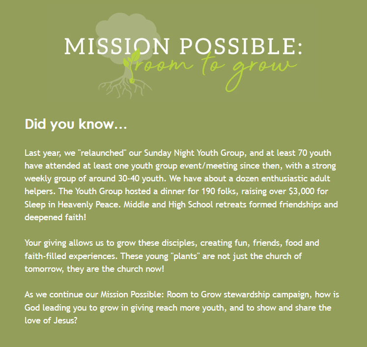 As Mother’s Day approaches, we give thanks for the gift of God’s love shared through mothers or people who have been like mothers to us. We also give thanks this Sunday for our 2024 Graduates too. On one level, it doesn’t seem to take much to be able to “grow up.” Time waits for no one, and getting older happens, whether we like it or not. But as followers of Jesus, we are not just called to grow older, we are called to grow up” in faith, love and wisdom, to grow in knowledge of and love of our Lord, and to grow in generosity and giving. As we grow, our support of the church grows too – we give proportionally of what God has given us, to build up the church, to help it grow.