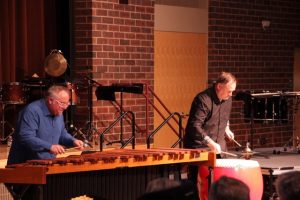 The expertise of Quey Percussion Duo members Dr. Gene Koshinski and Dr. Tim Broscious was on full display at our August 16 concert at what looked like a percussion playground set up in the Spirit Center. One hundred sixty people watched and listened as the musicians blew conches, beat a wide variety of drums, tapped a marimba, and jiggled bells wrapped around their ankles.